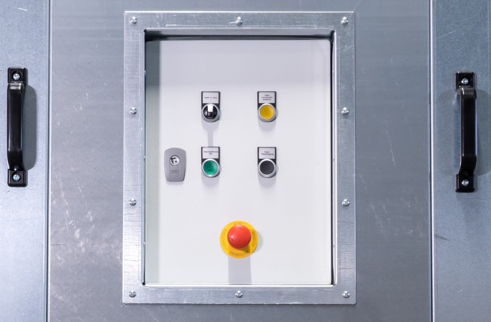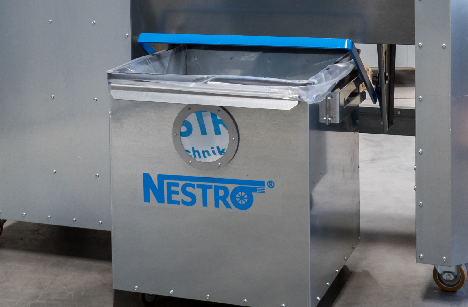 Clean air filter incl. suction connectors, right suction side, movable (4 wheels), to exhaust and filter wood dust and chips, with acceptance certification GS and H3 correspondent to GS-HO-07 (BGHM, German authority responsible for safety in the wood industry), pneumatic filter regeneration, 1 mobile bin (160 l, 4 wheels), e-motor 400 V / 50 Hz, on/off switch, 5 m cable with plug and reversing switch
