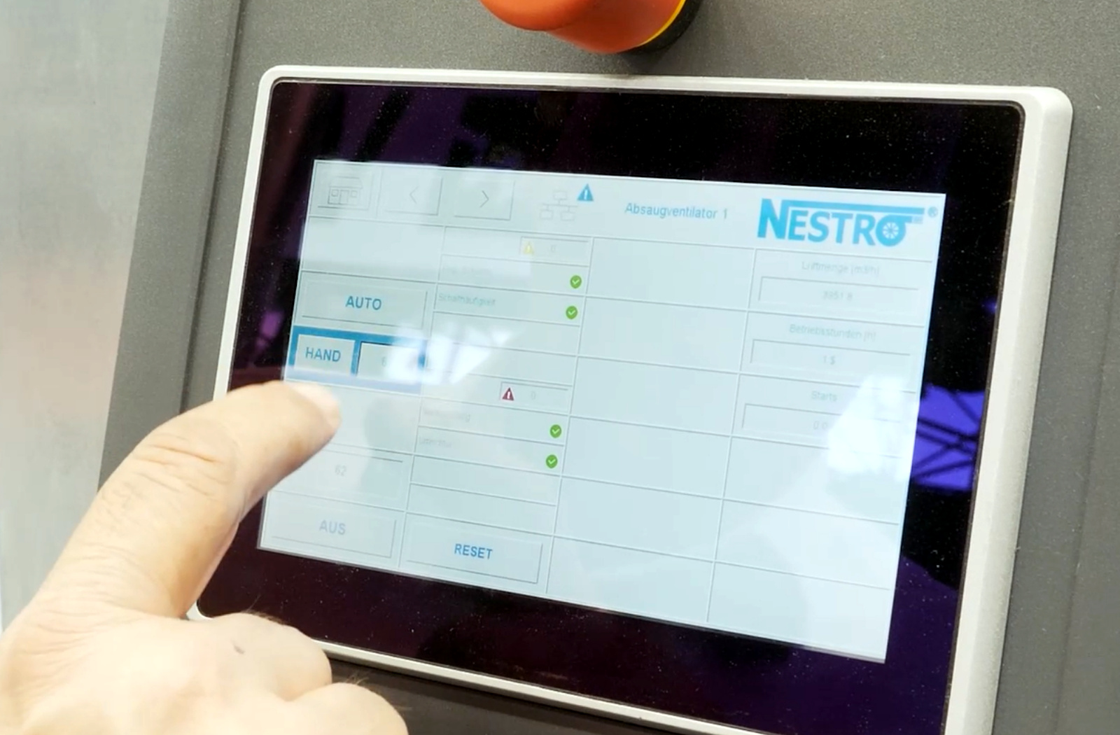 Clean air filter for the extraction and filtering for wood dust and chips. Certification GS and H3 correspondent to GS-HO-07 (BGHM, German authority responsible for safety in the wood industry) in progress. Fire protection flap / oxygen lock. Clean air filter with JET regeneration (compressed air pulses) incl. suction connectors, 5 m cable for connection junction box (protective measure zeroing), synchronous reluctance-motor IE5 with frequency converter, wired control color touch panel 7'' with integrated emergency switch-off. For the connection of up to 10 processing machines. Suction socket left / fan right side as standard
